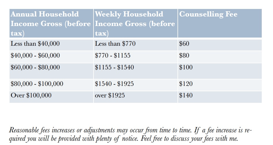 My fees are based on your combined household income. The table below outlines the fee scale. If you have any questions please do contact me to discuss.